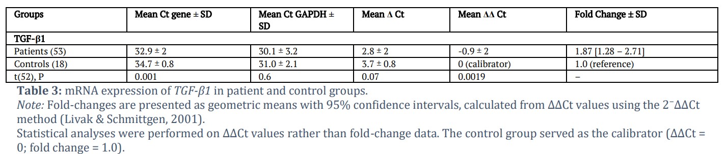 The present work is useful for understanding the effects of TGF-β1 in rheumatoid arthritis of Iraqi patients. In the context of the present investigation, it was confirmed that TGF-β1 gene expression was higher in RA patients than in healthy controls (ΔΔCt = −0.9 ± 2; t(52) = −3.28, P = 0.0019), corresponding to a geometric mean fold change of 1.87 [95 % CI: 1.28 – 2.71]. This finding corresponds to data from the literature indicating that TGF-β1 concentrations are elevated in serum and synovial lining membrane of RA patients, supporting the hypothesis that it can take part in the pathogenesis of the disease.