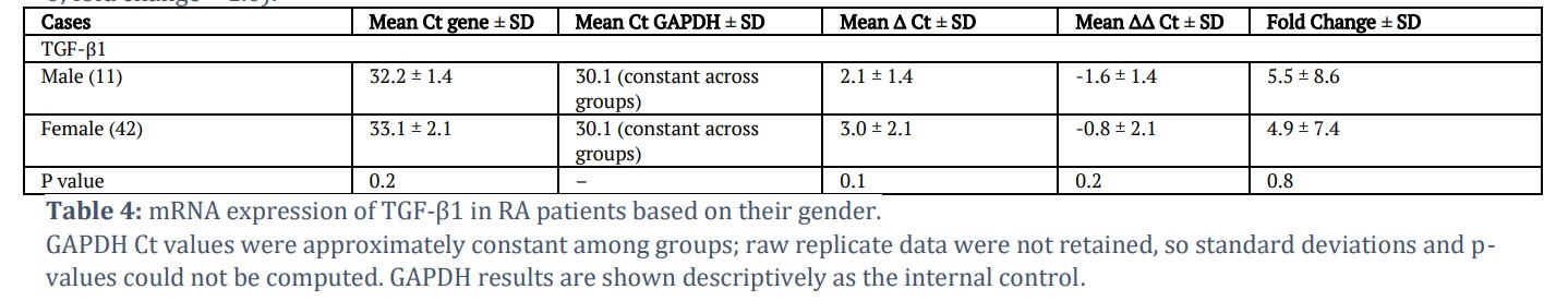 Assessment of mRNA expression of TGF-β1 in RA patients based on their gender