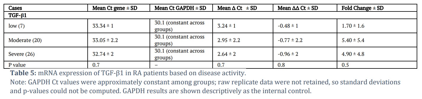 The importance of the clinical relevance of this discovery becomes obvious when giving attention to the fact that the level of TGF-β1 could be useful in the diagnosis of RA and may perhaps be useful in assessing the response of patients to treatment, yet it may not be particularly useful in determining the severity of the disease. More investigations, including the control of a higher number of patients and longitudinal research approaches, should be conducted to confirm these observations and to determine their treatment-related consequences. The absence of replicate variability data for GAPDH limits assessment of reference-gene stability; however, this does not affect ΔCt-based relative quantification of TGF-β1 expression.