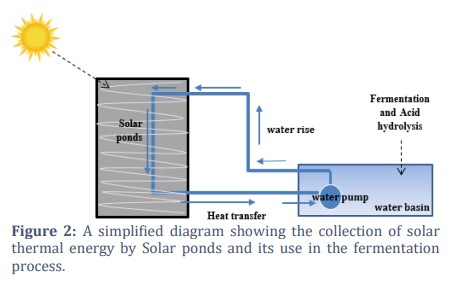 Solar pond technology collected thermal energy in the range of 45°C to 55°C. Then this heat was transferred through a closed water path to another basin, where the processes of acid decomposition and fermentation took place, as shown in Figure 2.