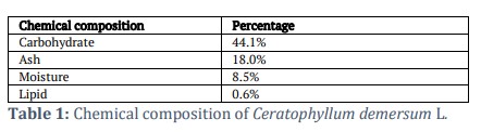 The chemical composition of the biomass of Ceratophyllum demersum L. was determined and reported in Table 1. The phenol-sulfuric acid method was used to determine the carbohydrate content [24]. Gusain et al., [25] method was used to estimate the total fat content. Finally, the total ash and moisture content were estimated using the Association of Analytical Communities (AOAC) method.