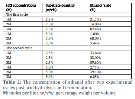 Saccharification was performed using different HCl concentrations. Table 2 shows the bioethanol production yields from different biomass concentrations and acid concentrations used during the acidic hydrolysis and fermentation process.