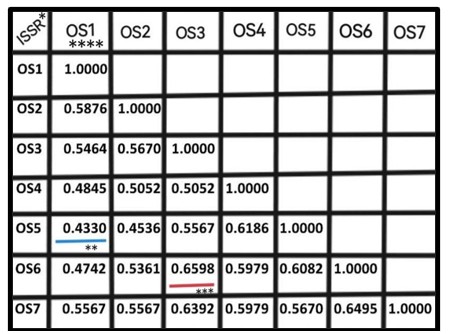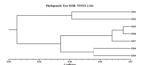 OS5 exhibited the highest number of unique ISSR bands (9), followed by OS4 (8), OS1 and OS6 (6 each), OS3 (4), OS2 (3), and OS7 (2). Absent bands were detected in OS4 (1), OS6 (2), and OS7 (1). These distinct banding profiles support the presence of genetic differentiation among the isolates.