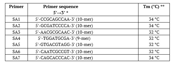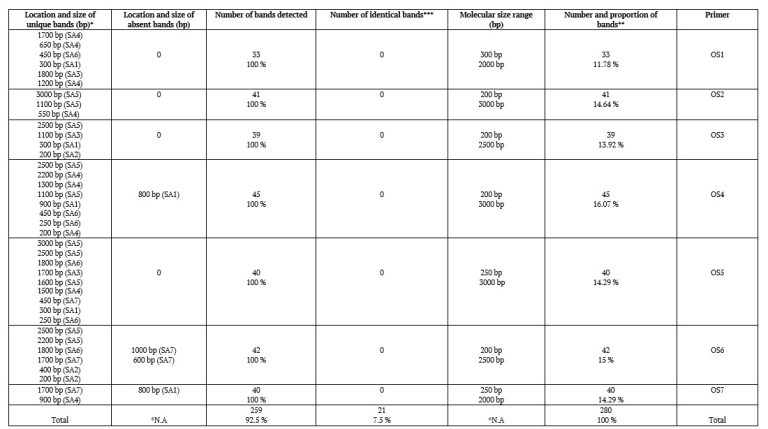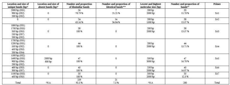 A total of 280 bands were amplified, with 259 (92.5%) being polymorphic and 21 (7.5%) identical across species. Polymorphic bands provide valuable markers for distinguishing closely related taxa. Shared bands, observed predominantly with primers SA1 and SA2, indicate conserved loci identical across species, which can aid in the classification of unknown strains [14].