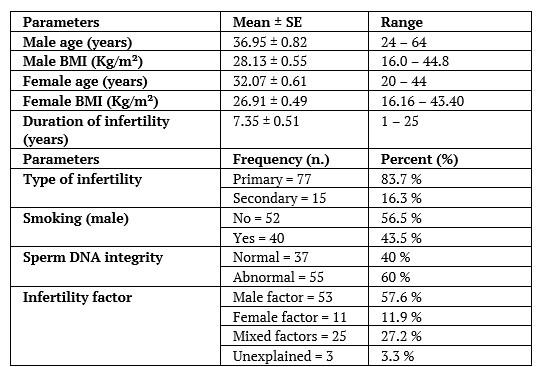 The demographic and clinical characteristics of the couples who participated in this study are summarized in Table 1. The table presents data on age, body mass index (BMI), and infertility duration for both males and females, along with information on smoking status, sperm DNA integrity, and causes of infertility. A total of 92 infertile couples enrolled in the ICSI program. The age of male participants ranged from 24 to 64 years, with a mean age of 36.95 ± 0.82 years. Female participants were aged between 20 and 44 years, with a mean age of 32.07 ± 0.61 years. Regarding body mass index (BMI), males had a mean BMI of 28.13 ± 0.55 kg/m², while females had a mean BMI of 26.91 ± 0.49 kg/m². The duration of infertility varied from 1 to 25 years, with a mean of 7.35 ± 0.51 years. Among the couples, 83.7% presented with primary infertility. In terms of smoking habits among males, 52 participants (56.5%) were non-smokers, while 40 (43.5%) were smokers. Regarding sperm DNA integrity, 37 participants (40%) had normal sperm DNA integrity, whereas 55 participants (60%) exhibited abnormal sperm DNA integrity. The most common cause of infertility was male factor infertility, affecting 53 participants (57.6%). Mixed factors contributed to infertility in 25 participants (27.2%), while female factor infertility was observed in 11 participants (11.9%). Unexplained infertility was reported in 3 participants (3.3%).