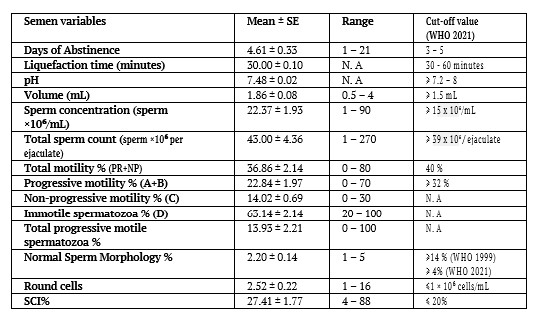 The semen parameters of the male participants in this study are summarized in Table 2, presenting various semen variables based on the WHO 2021 guidelines. The table provides an overview of the key parameters evaluated, including SCI and other semen analysis metrics. The participants had an average abstinence period of 4.61 ± 0.33 days. Semen samples liquefied within an average time of 30.00 ± 0.10 minutes. The pH of the semen was 7.48 ± 0.02, reflecting a slightly alkaline environment. The mean semen volume was 1.86 ± 0.08 mL.