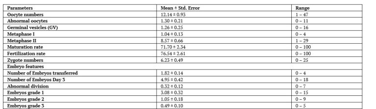 The quality of oocytes and characteristics of embryos resulting from the ICSI procedure provide detailed insights into various parameters related to retrieved oocytes and embryo outcomes in this study (Table 3). The table summarizes key data on oocyte retrieval and embryo grading, including the quality of embryos obtained. These parameters include the average number of oocytes retrieved (12.14 ± 0.93), abnormalities, developmental stages, maturation and fertilization rates, zygote numbers, and embryo features such as the number of embryos transferred and their grades. The data present both the range and average values for each parameter, offering a comprehensive understanding of oocyte and embryo quality and development observed in the study.
