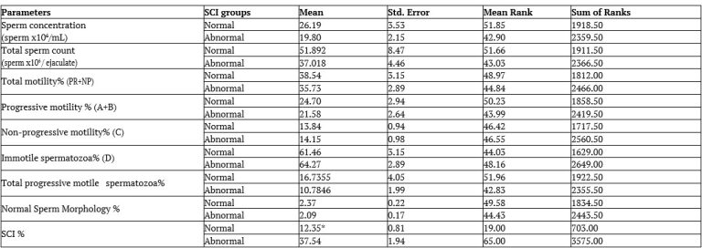 When the samples were categorized based on DNA integrity, the descriptive information and semen parameters showed no significant differences between the groups (Table 4), with the exception of SCI%. The table presents the mean ± standard error (SE), mean rank, and sum of ranks for various semen parameters. A total of 92 semen samples were analyzed, with 37 samples classified as having normal SCI% and 55 samples classified as having abnormal SCI%. Statistical differences between groups were assessed using the Mann-Whitney test.