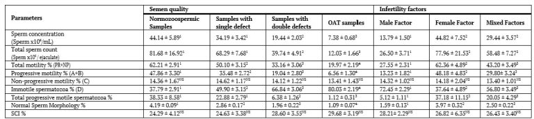 The normozoospermic group showed the highest percentage of total progressive motile spermatozoa, with significant differences when compared to the other groups. Conversely, the OAT group exhibited the highest percentage of immotile spermatozoa, with significant differences observed between groups. Additionally, the normozoospermic group demonstrated the highest percentage of normal sperm morphology, with significant differences compared to the other groups. However, no significant differences were observed in non-progressive motility (%) or SCI% either within or between groups.