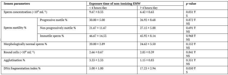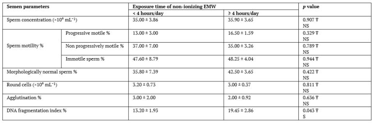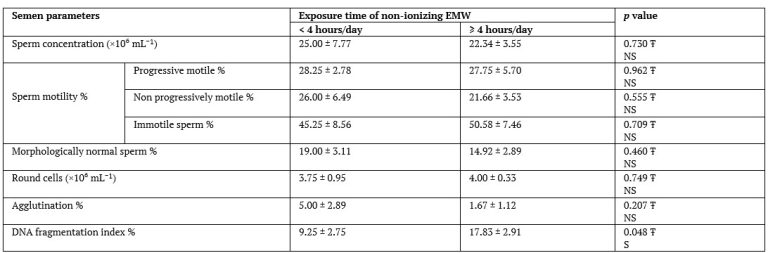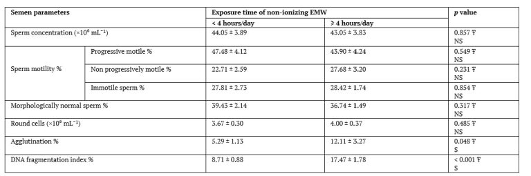 There was significantly higher sperm agglutination (12.11 ± 3.27 vs. 5.29 ± 1.13; p = 0.048) and DNA fragmentation index (17.47 ± 1.78 vs. 8.71 ± 0.88; p < 0.001) in individuals exposed to non-ionizing radiation for more than four hours.