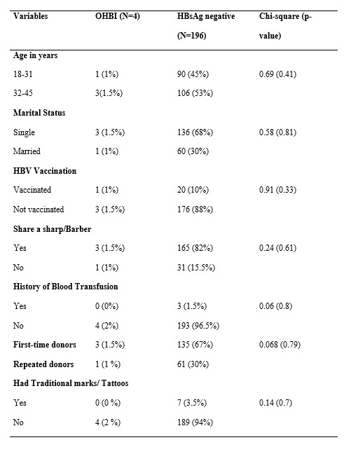 The demographic characteristics of blood donors in this study show interesting trends in age distribution and in vaccination status for occult HBV infection (OHBVI) and HBsAg-negative status. The majority of OHBI donors were aged 18-45 years, a finding in keeping with previous studies [37], which reported a peak prevalence of OHBI cases amongst individuals aged 31-39 years. The majority of OHBI donors (75%) were aged 32–45 years, consistent with previous reports showing higher occurrence among middle-aged adults [37]. Marital status among donors revealed that the majority were not married, with prevalence rates of 3 (1.5%) among OHBI donors and 136 (68%) among HBsAg-negative donors. This aligns with the findings of Salawu et al. (2011) [32], who reported a similar trend among unmarried donors in Ile-Ife (55.9%). However, this contrasts with the findings of Busari et al. (2018) [37], who observed that more than half of their donors were married. Despite these demographic and risk factor differences, no significant distinction was observed between donors with OHBI and those without it in terms of age, transfusion history, vaccination status, marital status, or other factors. This lack of a significant difference may be attributed to the small number of individuals with OHBI in the study, consistent with previous findings [22, 33].