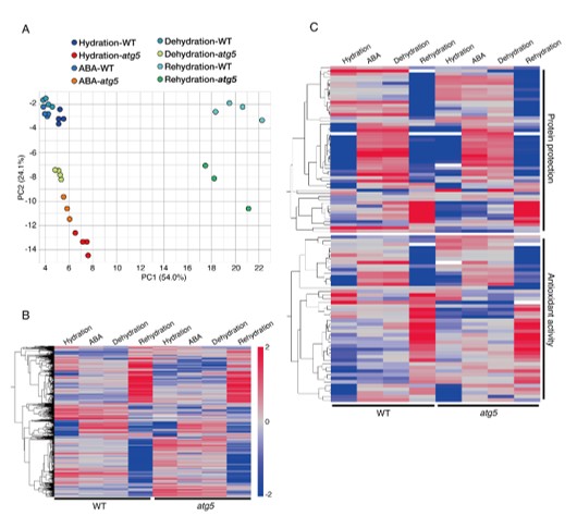Results: An integrated analysis showed that signaling pathways involved in MYBs and MAPKs were activated and that protective proteins such as LEAs and antioxidant-related proteins were not differentially expressed between the WT and atg mutant. This suggests that the atg mutant is highly tolerant to desiccation stress through the activation of cell proliferation during dehydration and rehydration.