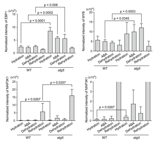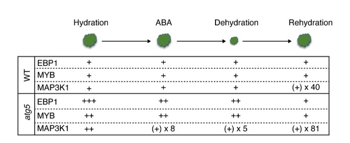 In this study, we found that proteins and pathways involved in cell proliferation and transcription/translation are highly expressed and activated in atg5, which has higher desiccation tolerance than does WT in response to ABA, dehydration and rehydration. Previous studies have revealed that the induction of protective proteins such as LEAs [24], activation of antioxidants [25], activation of DNA repair systems [26], and accumulation of sugars [27] are involved in the acquisition of desiccation tolerance. However, there is no clear evidence for cell proliferation during dehydration or rehydration. In this study, we identified EBP1, MYB, and MAP3K1 as transcription factors involved in cell proliferation for desiccation tolerance; and EBP1 is an RNA-binding protein that binds to the cytoplasmic domain of ERBB3, thereby signaling cell growth. In Arabidopsis, ERBB3 homologs have been reported to be involved in mitotic tissue proliferation [28]. MYBs are transcription factors and are involved in plant growth and development, and MYB overexpression has been shown to induce resistance to drought and salt stresses [29]. Thus, the accumulation of EBP1 and MYBs in plants affects cell proliferation and growth, but the detailed mechanisms underlying these processes with respect to desiccation stress are not clear. In addition, MAPKs are highly conserved signaling modules that are involved in many signaling processes through MAPK cascades, transducing and amplifying signals to downstream proteins through stepwise phosphorylation and activating various cellular functions such as cell growth [30]. In atg5, EBP1 accumulated at basal levels (under unstressed and hydrated conditions) and also showed accumulation in response to ABA and dehydration. MYB showed no significant difference from the WT under basal condition, although it tended to accumulate more in atg5 than in the WT.
