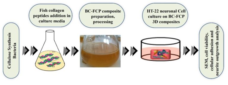 In the current study, the fabricated BC–FCP matrices were examined for numerous organizational and biological features to explore the cell-scaffold interaction. The currently designed bioengineered composite will potentially provide a more accurate perception of cell-cell and cell-matrix interaction in neurite outgrowth. Importantly, the single-step preparation of BC–FCP composites offers a simple and scalable fabrication approach highly desirable for biomedical applications. The BC–FCP composite exhibits a nanofibrous network resembling the native ECM, excellent biocompatibility, and enhanced biofunctionality through the incorporation of FCP. The aim of the current study is to develop a biocompatible 3D cell culture model based on natural BC-FCP biopolymers to enhance the biocompatibility of neural cells and create a suitable microenvironment for neurite adhesion, proliferation and differentiation.