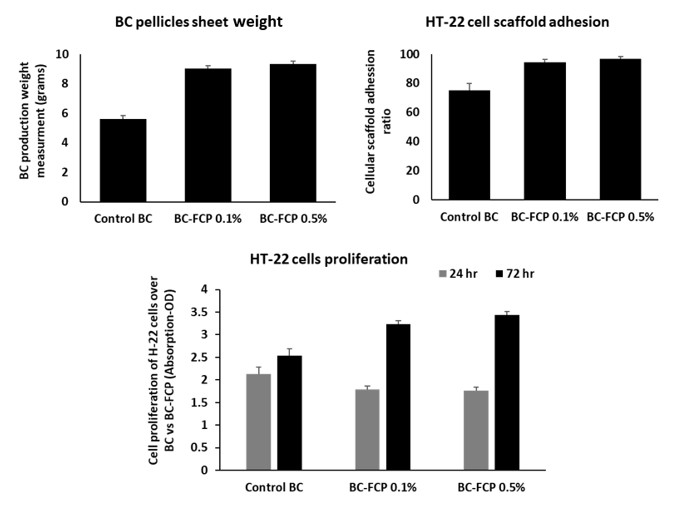Increased BC production upon FCP incorporation suggests a stimulatory effect on Gluconacetobacter xylinum, potentially due to improved nutrient bioavailability or enhanced microbial metabolism mechanisms that merit further exploration. As seen in Figure 3, the dose-dependent increase in BC yield reinforces this hypothesis. Cellular adhesion assays demonstrate that low molecular weight collagen peptides effectively promote HT-22 cell binding, aligning with previous work showing their superior bioactivity [11, 13].