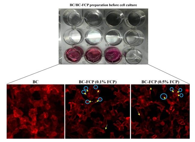 Interestingly, while BC alone supports high short-term proliferation, FCP-functionalized BC maintains a more stable long-term cell viability. This indicates that the biophysical and biochemical cues imparted by FCP enhance cell-scaffold interactions over time.