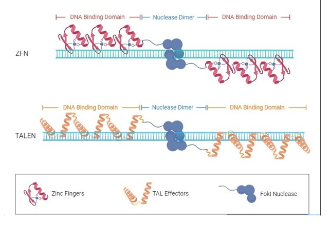 Programmable nucleases, such as zinc-finger nucleases (ZFNs), transcription activator-like endonucleases (TALENs), and CRISPR-associated Cas9 endonucleases, have been employed in the treatment of human cancer, infectious diseases, and genetic disorders [62,65-67]. Zinc finger nucleases (ZFNs) are chimeric nucleases consisting of a nonspecific FokI endonuclease domain fused to a sequence-specific DNA-binding domain [65]. This DNA-binding domain is composed of multiple zinc finger protein motifs, each typically recognizing a specific nucleotide triplet. The number and arrangement of these motifs determines both binding affinity and sequence specificity [65], as displayed in Figure 3.