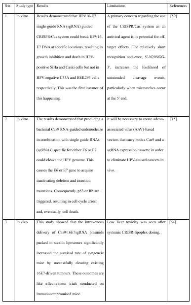 The CRISPR/Cas9 system can be delivered to cells via various methods, including protein, mRNA, or DNA. Plasmids and adeno-associated viruses (AAVs) are commonly used viral vectors for introducing DNA encoding gRNA and Cas9. AAVs have a strong track record of safety and efficacy in clinical trials, making them a promising gene delivery vehicle. CRISPR/Cas9 delivered by AAV has been successfully employed to target numerous genetic diseases [23]. In the context of HPV18-related cancers, the AAV-E6-CRISPR/Cas9 system has been utilized to disrupt the E6 oncogene in HeLa cells. This disruption resulted in increased cell death and decreased cell growth, along with the restoration of p53 expression [23,26].
